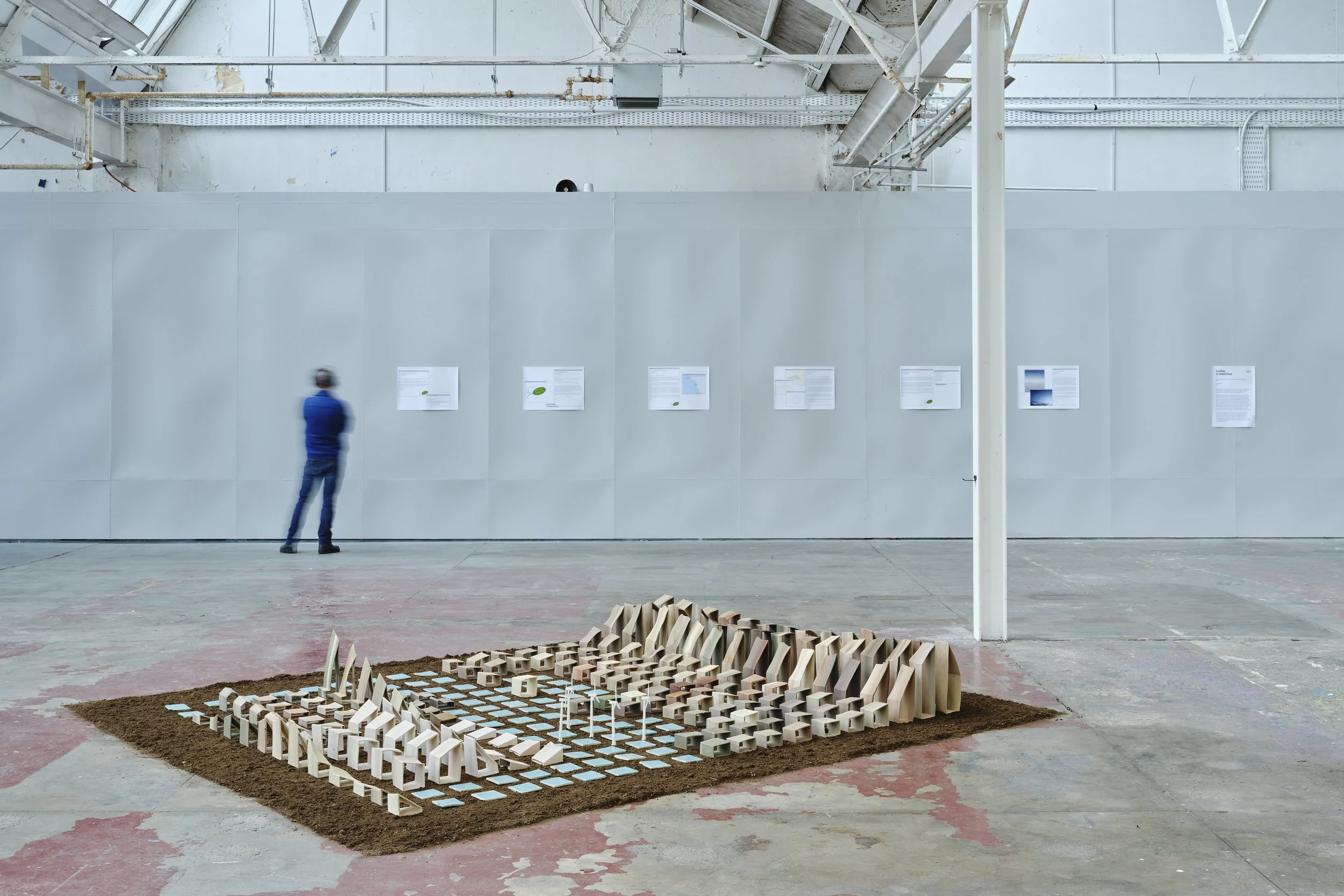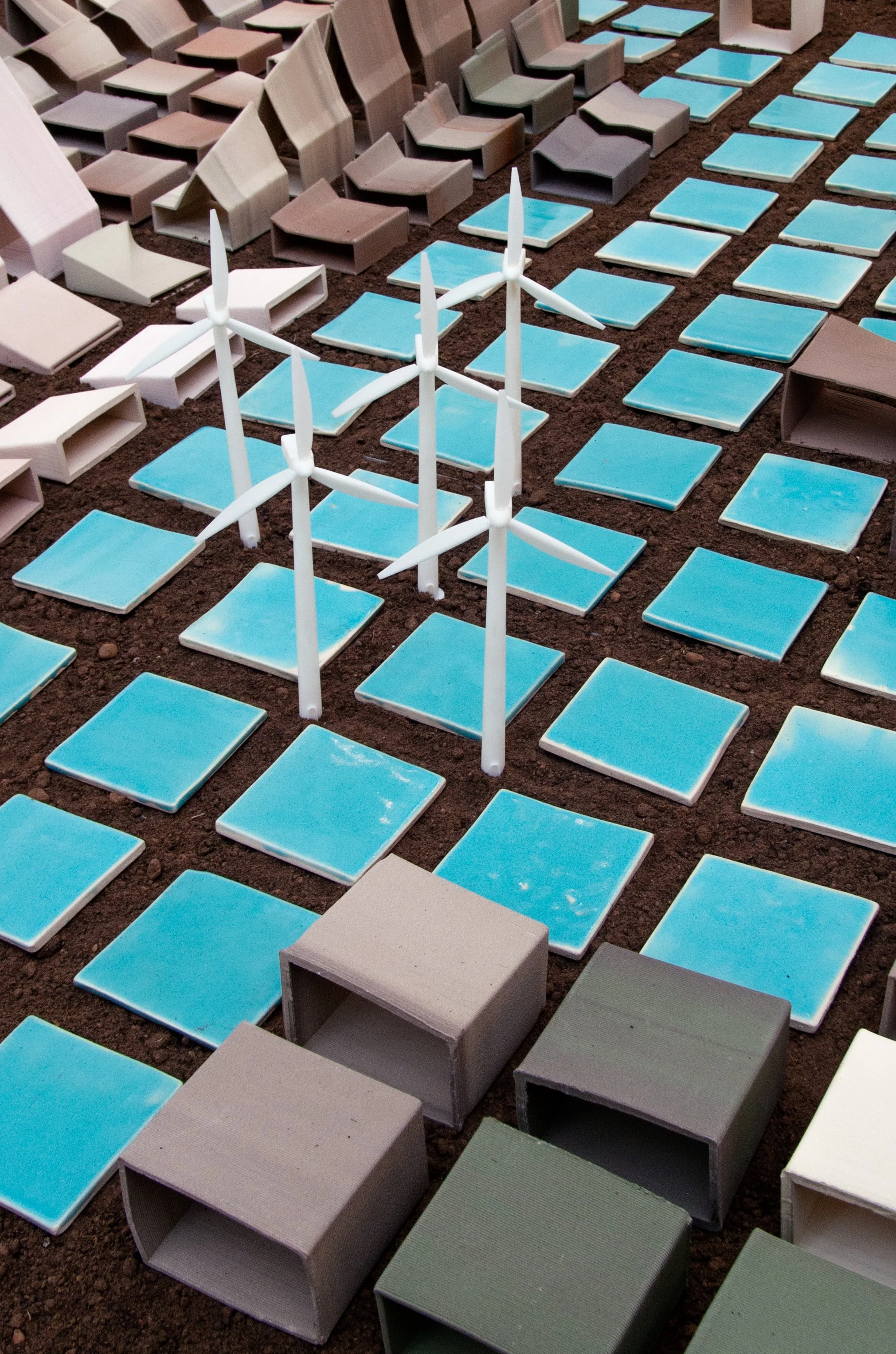 Materials: 3D printed ceramic data sets stained with iron oxide and chrome; Domestic Extraction in Ireland 1994-2018, Greenhouse emissions in Ireland 1994-2007, Construction emissions rates in Ireland 2009-2017, CO2 emissions in the United Kingdom 1990-2018, 3D printed resin wind turbines, soil